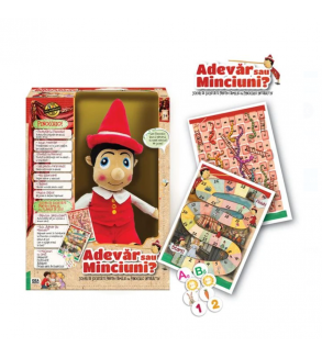 Pinocchio este o papusa electronica, educativa, care vorbeste limba romana si cu vocea lui amuzanta, spune povesti, farse, istorisiri despre eroi care au spus multe minciuni, jocuri teatrale si multe glume! Joaca si joc de societate tip quiz „Adevar sau Minciuna?” impreuna cu prietenii, mama si tata! Pinocchio rosteste intrebarile si ei avanseaza pe tabla, daca raspund corect.