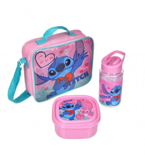 Set de masa pentru fete, compus din geanta izoterma cu figurina lui Stitch pe capac, caserola si sticla cu mecanism pop-up. Geanta se inchide cu fermoar si are bretea si maner de culoare verde. Caserola cu capacitate de 720ml, de culoare roz, are un compartiment si capac cu acelasi model, poate fi utilizata in cuptorul cu microunde si in masina de spalat vase, iar capacul este complet detasabil. Sticla, cu capacitate de 480ml, are mecanism pop-up, pai din silicon si maner tip inel pentru transport facil, nu poate fi utilizata la cuptorul cu microunde si nici in masina de spalat vase.