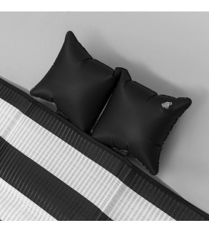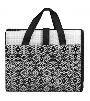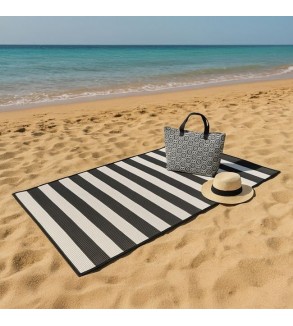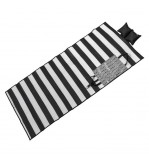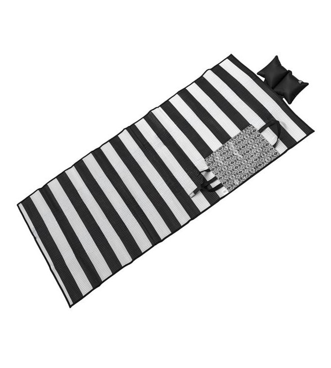 Rogojina pentru plaja din plastic, tripla cu model delicat de vara, turcoaz cu dungi bleu cu model Let' go to the Beach pe geanta si perna gonflabila de 40x17cm. Se pliaza in forma de geanta si se leaga pentru transport usor. Are o tesatura densa ce nu permite trecerea nisipului.