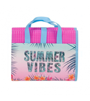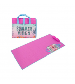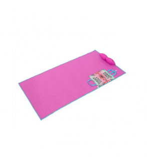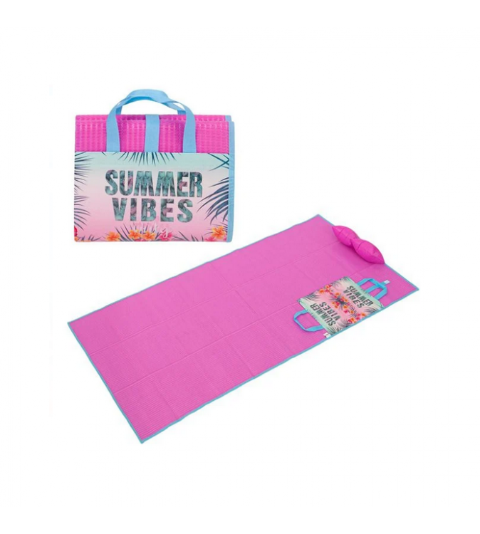 Covoras de plaja durabil, unic, plastic de culoare roz cu model de vara si perna gonflabila 40x17 cm.