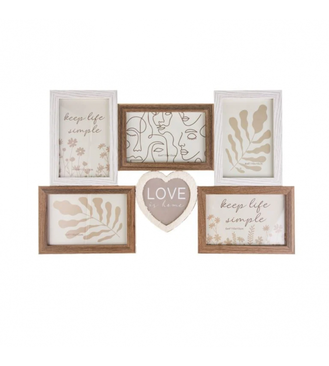 Rama foto, cu 4 rame cu margine din lemn de culoare neagra si 4 de culoare naturala, aranjate combinat, si mesaj din lemn "Home Sweet Home".