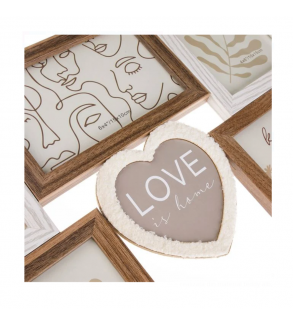 Rama foto cu cadru din lemn de culoare alba si naturala inchisa, iar inima este realizata din material teddy alb, asezate intr-o dispunere dreptunghiulara.