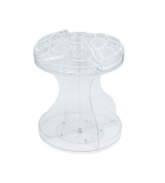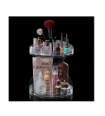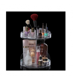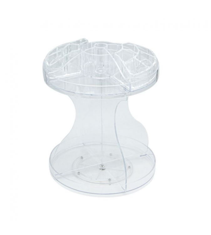 Suport cosmetica din acril transparent cu rotatie de 360º. Are 2 nivele cu 2 tavi mari si 2 compartimente suplimentare cu cate 5 sloturi pentru pachete mici. Distanta dintre cele 2 nivele este de 24 cm, iar adancimea tavilor este de 3 cm.