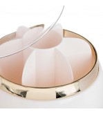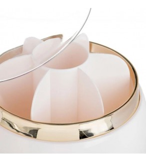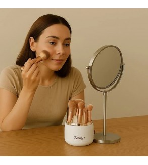Suport pentru pensule de machiaj cu baza crem, detalii aurii si capac transparent. Are 7 compartimente si capacitate de rotire completa. Astfel, va va fi mai usor in timpul machiajului sau cand va depozitati uneltele si produsele cosmentice. Cu capacul transparent puteti vedea cu usurinta continutul.
