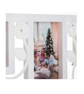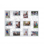 Rama decorativa pentru fotografii pentru 12 poze din plastic în forma dreptunghiulara cu ornamente si pasari, de culoare alba.