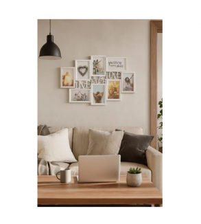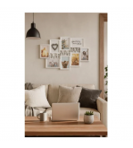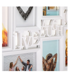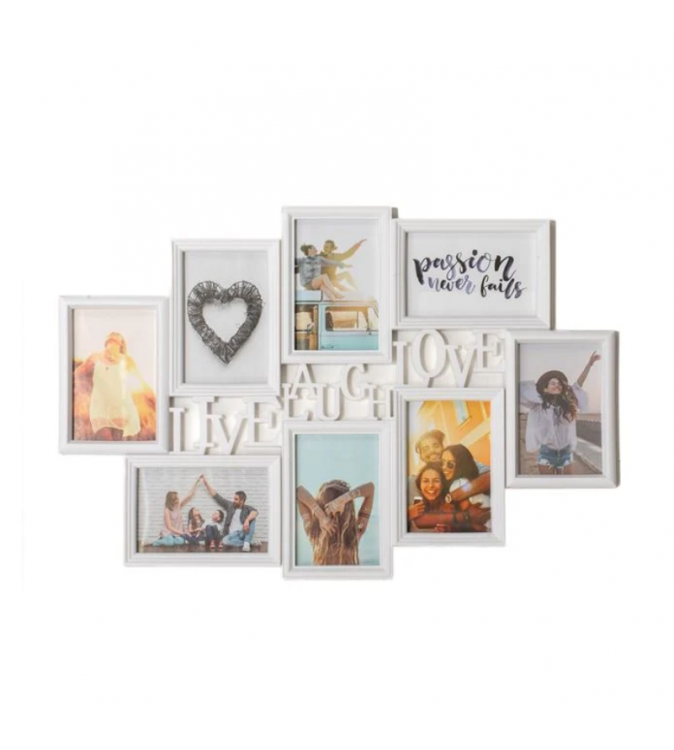 Rama decorativa pentru fotografii cu 8 rame intr-un cadru din plastic, cu mesajul "Live Laugh Love", de culoare alba.