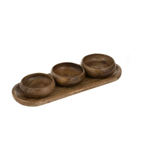 Platou din lemn de culoare maro, format din 1 tava ovala (35x13x13cm) si 3 boluri rotunde pentru aperitive (Ø10x4cm). Ideal pentru a servi gustari/sosuri.