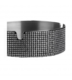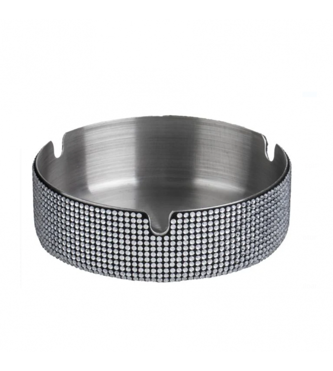 Scrumiera din otel inoxidabil, rotunda, de culoare argintie, cu strasuri argintii pe partea exterioara.