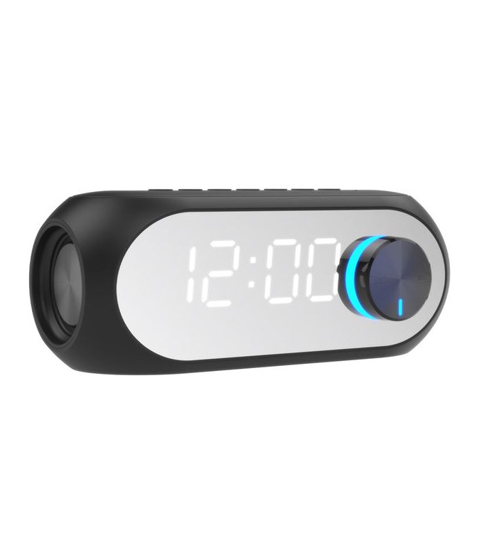 Boxa Bluetooth (5.0) cu ceas/alarma incorporate si radio. Cu indicator luminos LED si functie TWS pentru conectarea simultana a doua difuzoare intr-un singur dispozitiv. Include un cablu de incarcare micro cu lungimea de 1m si instructiuni.