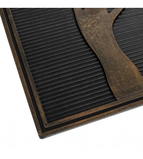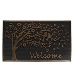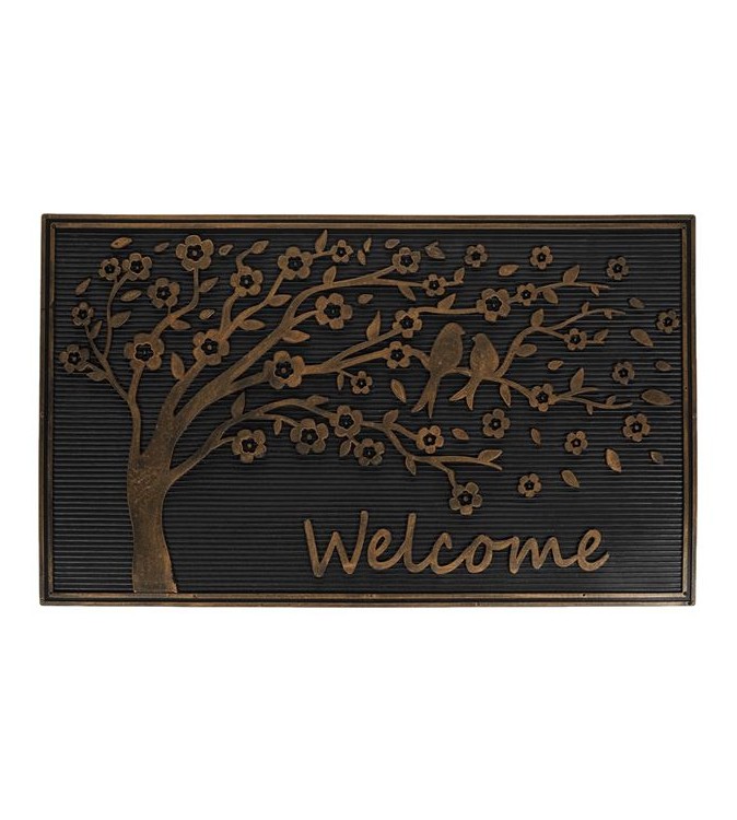 Covorasul de la intrare, maro, cu model de balustrada si mesaj caligrafic „Welcom”.