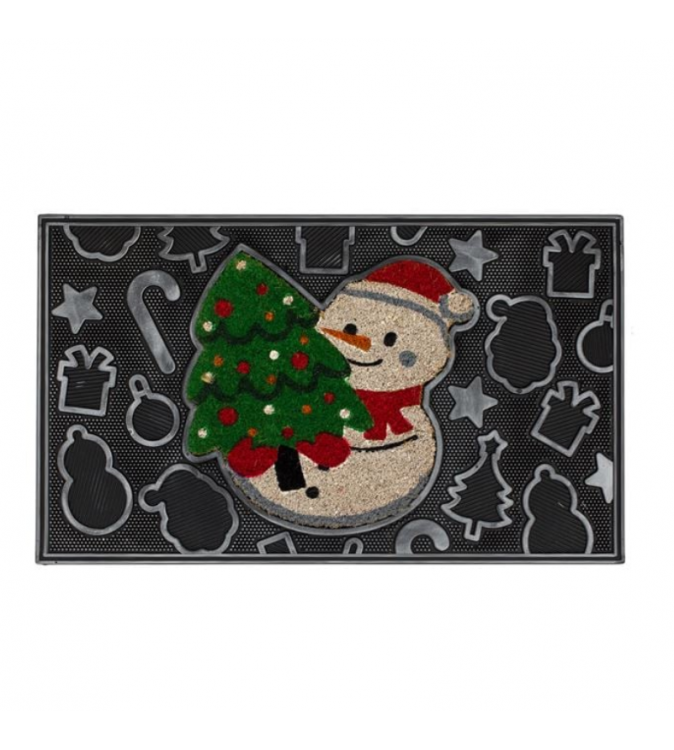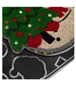 Covoras usa cu model de Craciun, de culoare neagra cu model om de zapada reliefat din fibre de nuca de cocos si ornamnte.