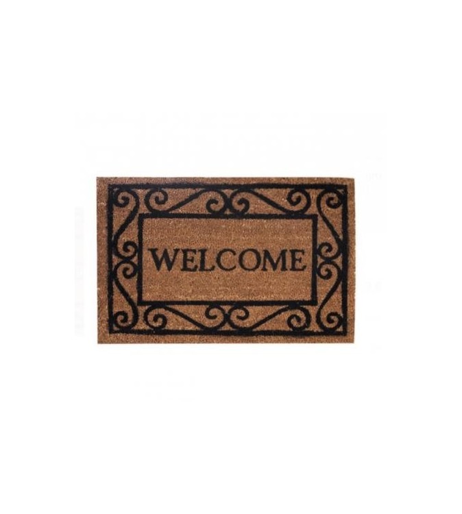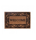 Covoras de intrare, in culori naturale, cu mesaj „Bun venit” si bordura neagra.