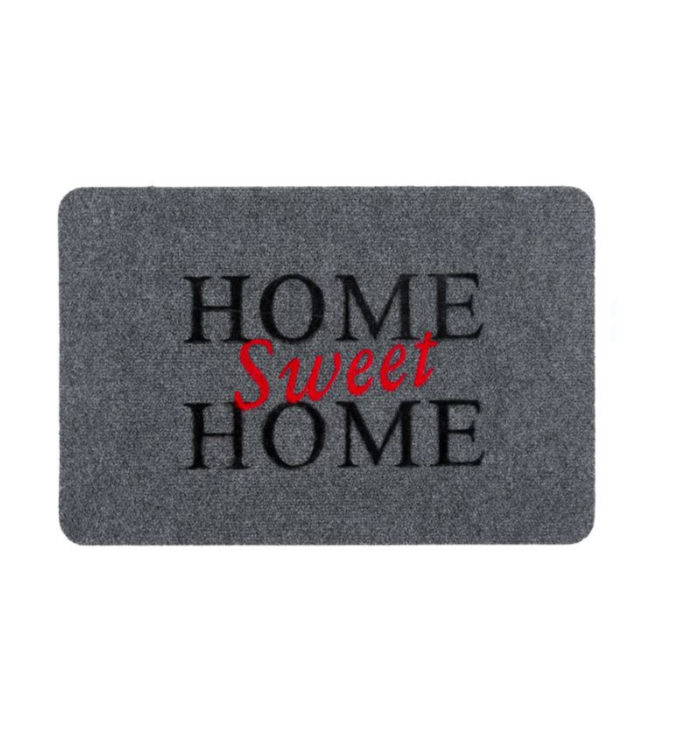 Covoras de intrare, gri cu mesajul „Home Sweet Home”.
