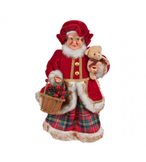 Figurina decorativa de Craciun, reprezentand sotia lui Mos Craciun, purtand o fusta in carouri si un palton rosu cu detalii din blana artificiala. Tine in maini un ursulet de plus si un cos, iar in par poarta o caciula catifelata.