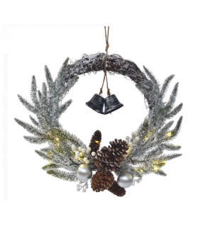 Coronita decorativa de Craciun cu aspect inzapezit, conuri de brad, berries perlate si lumini LED. Functioneaza cu 2 baterii tip CR2032 (incluse). Decorati-o cu globuri, strasuri, glitter sau candy, ramuri, flori, ornamente si lumini. Posibilitatile sunt nelimitate cand imaginatia nu are limite!