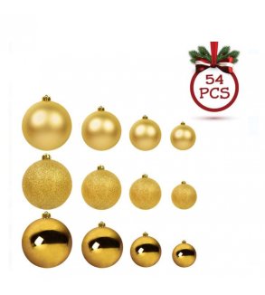 Ornamente brad de Craciun, globuri aurii de 4 marimi, stralucitoare, mat si cu glitter cu beteala in ambalaj.