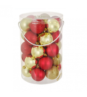 Contine: 30 de globuri de craciun de 7cm si o beteala de culoare rosie si aurie.