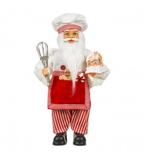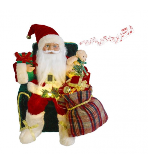 Figurina decorativa de Craciun, reprezentandu-l pe Mos Craciun asezat intr-un fotoliu verde catifelat, tinand cadouri si un ursulet de plus, iar la picioarele sale se afla sacul plin cu daruri. Este prevazuta cu lumina si melodie de Craciun (se poate selecta doar lumina sau lumina impreuna cu melodia). Functioneaza cu 3 baterii de tip AA (neincluse).