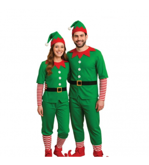 Costum de Craciun pentru adulti, costum de elf care include bluza, pantaloni, curea, acoperaminte pentru incaltaminte si caciula.