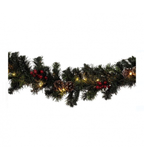 Ghirlanda decorativa de Craciun cu ramuri de brad, pomusoare, conuri ninse si lumini led. Functioneaza cu 2 baterii CR2032 (incluse).