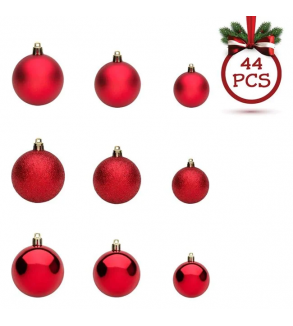 Ornamente brad de Craciun, globuri rosii de 3marimi, stralucitoare, mat si cu glitter in ambalaj.