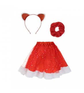 Set deghizare de Craciun pentru fete, fusta tutu din tul rosu cu 1 strat de tul si 1 strat captuseala, cu margine din blana artificiala alba, elastic in talie satinat rosu si buline din folie iridescenta. Include coronita de par cu urechi de pisica cu glitter rosu si blana artificiala alba si elastic de par catifelat rosu cu margine din blana artificiala alba.