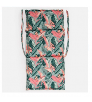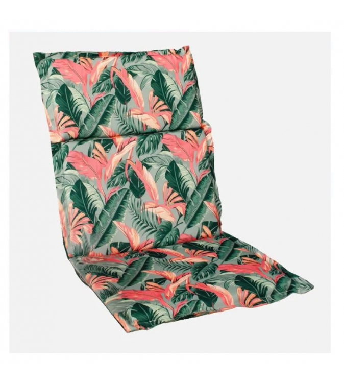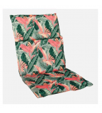 Perna pentru scaun cu spatar putin mai inalt, pentru exterior, de culoare verde cu model frunze tropicale roz si verzi, doua fete, fara fermoar. Din material rezistent la apa si snururi din acelasi material pentru fixare stabila. Materialul textil protejeaza impotriva unor cantitati mici de apa, dar nu impotriva expunerii continue. Pernele ofera un aspect frumos oricarui scaun pe care sunt asezate. Se potrivesc multor tipuri de scaune, iar sectiunile pernei au latimea de 39cm, 33cm si 21cm (sezut - spatar - tetiera).