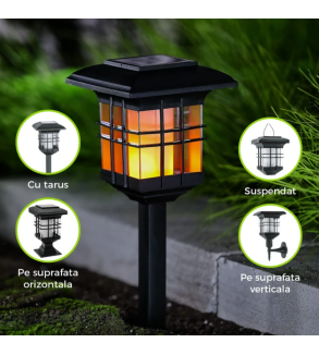 Fabricata din plastic rezistent, lampa este conceputa pentru a rezista la conditiile meteo variate, oferind durabilitate si fiabilitate pe termen lung. Efectul sau de flacara creeaza un joc de lumini placut si relaxant, perfect pentru a contura un ambient romantic sau pentru a adauga un element de design atractiv spatiilor exterioare. Modelul are dimensiunile 13.6 x 46 cm (diametru x inaltime).