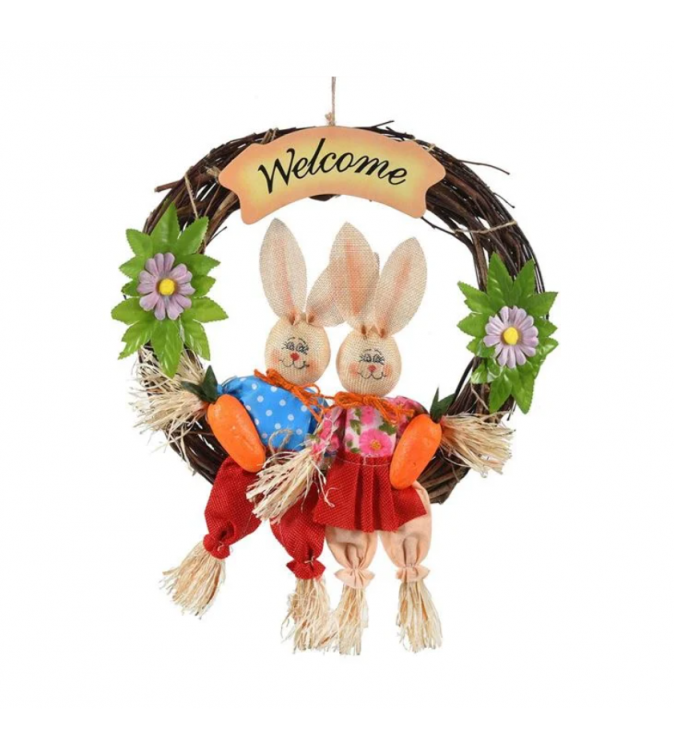 Coronita de Paste, suspendata cu 2 iepurasi din spuma cu morcovi, flori si mesaj "Welcome".