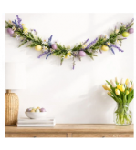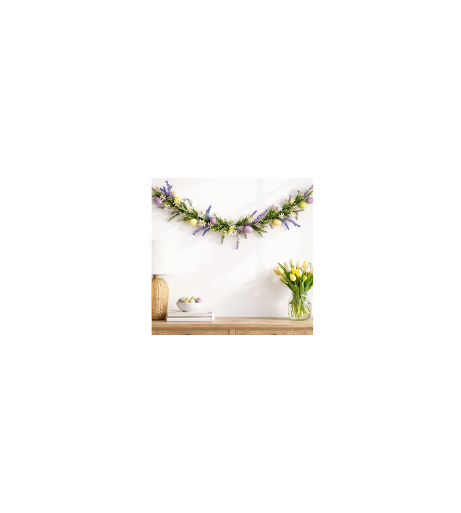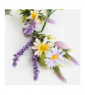 Ghirlanda decorativa de Paste, cu oua colorate din spuma in nuante pastel cu detalii negre, margarete in culori galben si lila si ramuri de lavanda si liliac.