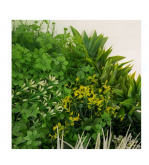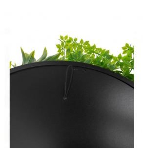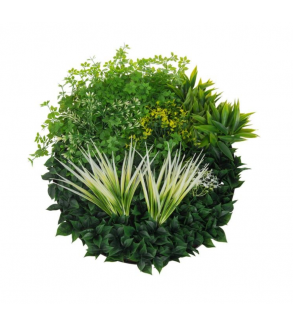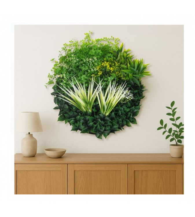 Tablou de perete cu rama rotunda din plastic, de culoare neagra, si model 3D cu plante verzi.