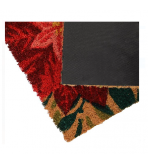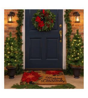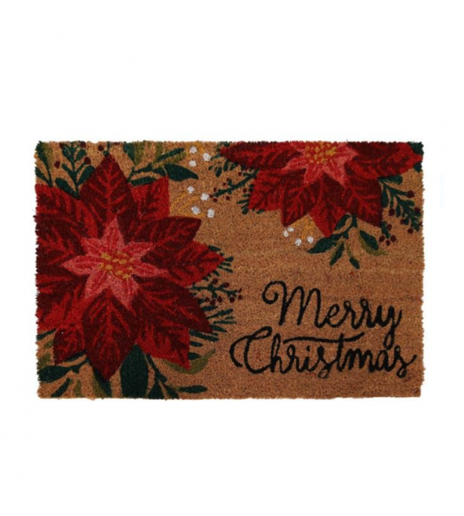 Covoras de Craciun pentru usa de la intrare, maro, cu model flori rosii si mesajul "Merry Christmas".