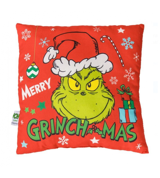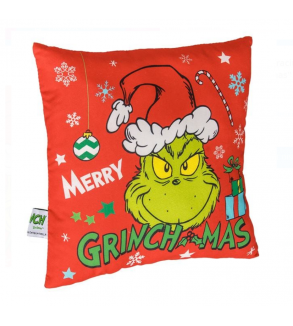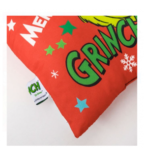 Perna decorativa de iarna de Craciun, de culoare rosie, cu model Grinch verde, cadou, globuri, stelute, fulgi de zapada si imprimeu „Merry Grinchmas”.