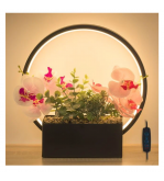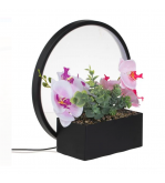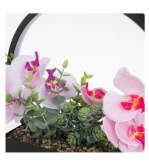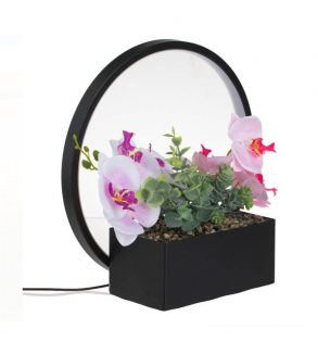Ghiveci cu plante suculente, orhidee de 2 culori (roz si lila) si pietricele decorative. Pe spatele ghiveciului se afla un inel cu 108 de LED-uri cu lumina calda si cablu USB de 140cm cu telecomanda pentru pornire/oprire si reglarea intensitatii luminii.