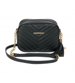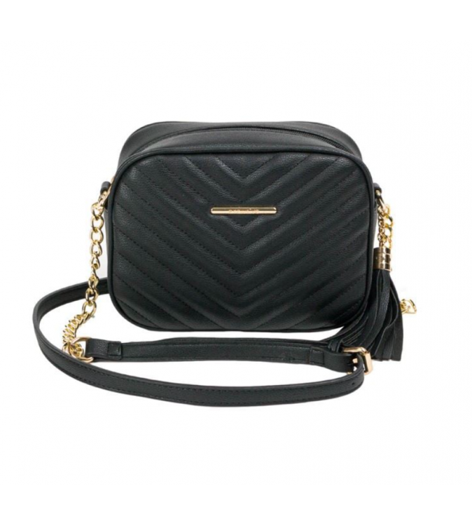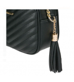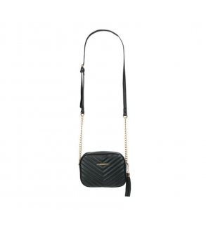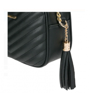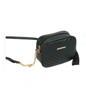 Poseta dama, de umar de culoare neagra, cu buzunar interior cu fermoar, curea lunga cu lant auriu şi franj la fermoar. Accesoriul ideal pentru orice ocazie.