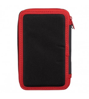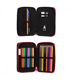 Penar dublu, de culoare roz, cu model ursulet. Contine creion, pix albastru, ascutitoare din plastic, radiera, rigla dreapta de 15cm, rigla dreapta cu forme de 15cm, echer de 10cm, 12 creioane colorate si 12 carioci.