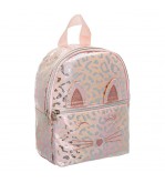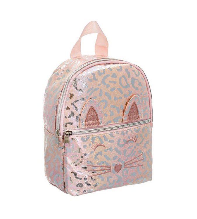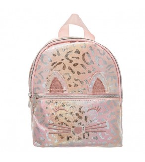 Ghiozdan pentru fete, pisica leopard, cu paiete 3D, detalii holografice si folie leopard. Are un compartiment mare, un buzunar frontal, fermoar argintiu si bretele roz reglabile.