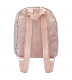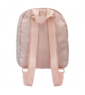 Ghiozdan pentru fete, cu un compartiment si buzunar in fata, de culoare roz holografic cu model rainbow si pompon. Are fermoare durabile si curele reglabile.