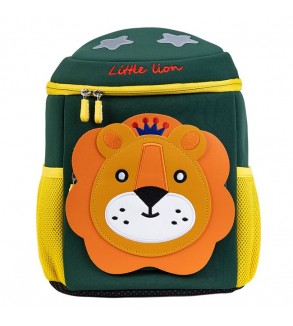 Ghiozdan pentru gradinita cu model leu catifelat, doua stele in partea de sus si mesaj "Little lion". Are 1 compartiment mare si un buzunar mare, buzunar frontal cu fermoar si 2 buzunare laterale cu plasa.