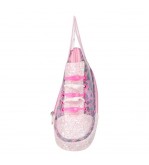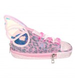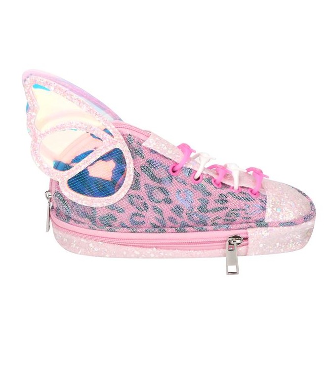 Penar cu fermoar, 2 compartimente, pantof sport roz cu aripi de fluture irizate, glitter roz si model animal print roz.