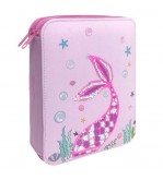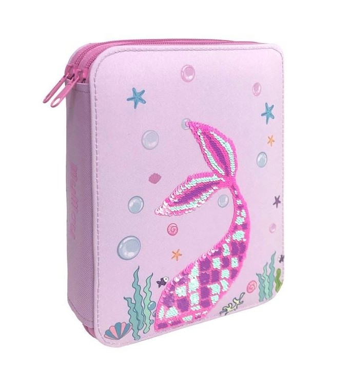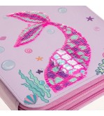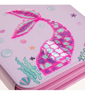 Penar scolar lila cu model coada de sirena si paiete magice colorate. Contine creion, pix albastru si negru, ascutitoare din plastic, guma de sters, rigla dreapta de 15cm, 18 creioane colorate, 12 creioane cerate, 1 foarfeca si 18 carioci.