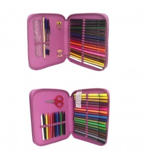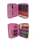 Penar dublu lila cu glitter irizat si model sirena. Contine creion, pix albastru, ascutitoare din plastic, radiera, rigla dreapta 15cm, rigla dreapta 15 cm, rigla dreapta de 15cm cu forme, triunghi de 10cm, 12 creioane colorate si 12 carioci.