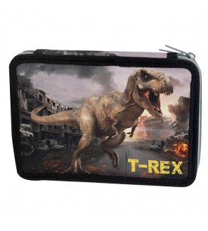 Penar dublu negru, gri si bej cu model dinozaur T-Rex. Contine creion, pix albastru, ascutitoare din plastic, radiera, rigla dreapta 15cm, rigla dreapta 15 cm, rigla dreapta de 15cm cu forme, triunghi de 10cm, 12 creioane colorate si 12 carioci.