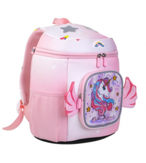 Ghiozdan pentru gradinita, roz cu model unicorn si confetti argintii. Are un compartiment mare si un buzunar spatios, buzunar frontal cu fermoar, 2 buzunare laterale cu plasa roz si maner roz.