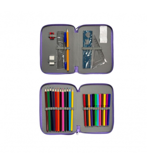 Penar dublu lila cu glitter irizat si model sirena. Contine creion, pix albastru, ascutitoare din plastic, radiera, rigla dreapta 15cm, rigla dreapta 15 cm, rigla dreapta de 15cm cu forme, triunghi de 10cm, 12 creioane colorate si 12 carioci.