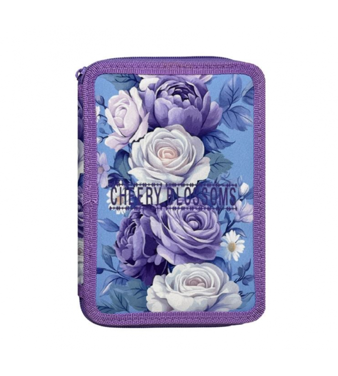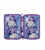 Penar dublu design mov si model trandafiri. Contine creion, pix albastru, ascutitoare din plastic, radiera, rigla dreapta 15cm, rigla dreapta de 15cm cu forme, triunghi de 10cm, 12 creioane colorate si 12 carioci.
