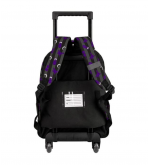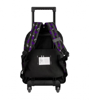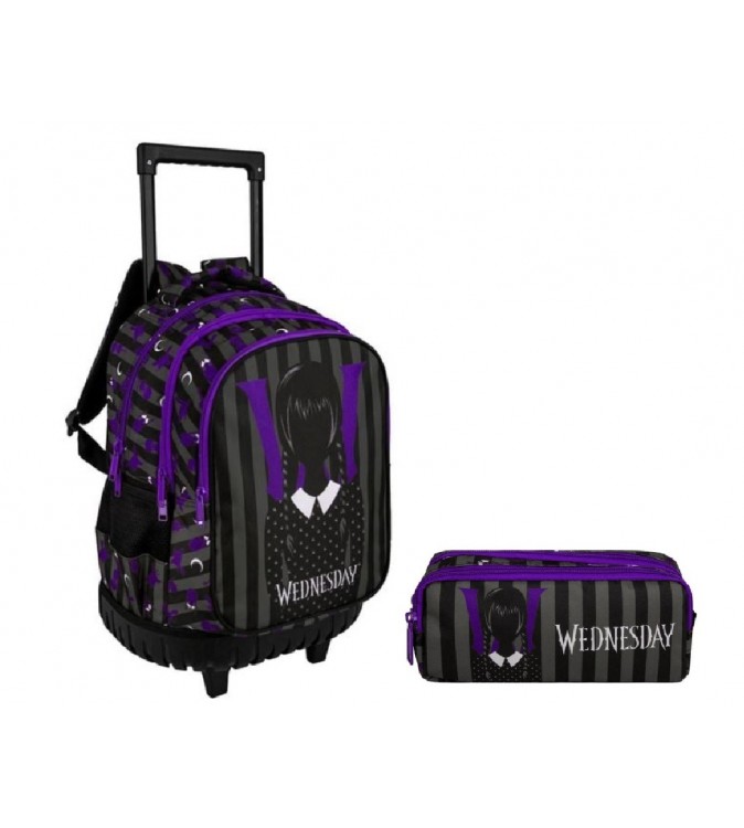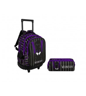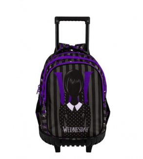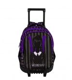 Ghiozdan - troler pentru scoala, de culoare neagra, gri si mov cu imprimeu Wednesday. Dispune de 1 compartiment mare, 1 compartiment mai mic si 1 buzunar mare in fata. Cu fermoar mov, 2 buzunare laterale cu un buzunar din plasa si o eticheta pe spatele exterior pentru datele copilului. Cu maner extensibil depana la 82cm, roti cu capac din plastic transparent cu glitter pentru durabilitate mai mare, baza de suport si curele moi dintre care una are o banda reflectorizanta.