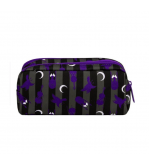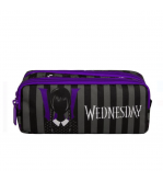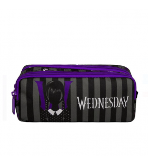 Penar tub negru si mov cu doua compartimente, cu 1 buzunar care se inchide cu banda adeziva cu scai, cu fermoar mov si model Wednesday.