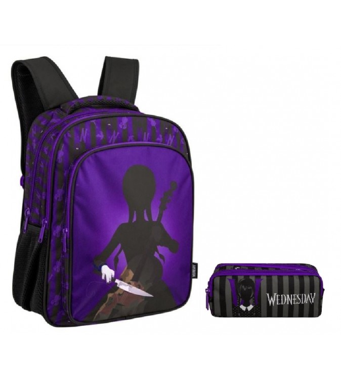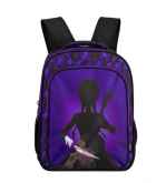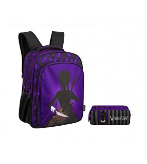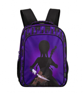 Ghiozdan pentru scoala, mov cu imprimeu Wednesday. Are 3 compartimente cu fermoare rezistente si inchizatoare metalice. Cu spate anatomic si curele ergonomice.