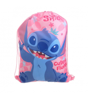 Rucsac de vara pentru fete, cu snururi roz care se strang tip saculet, de culoare roz, cu design Stitch si imprimeare "Cute & Fluffy".